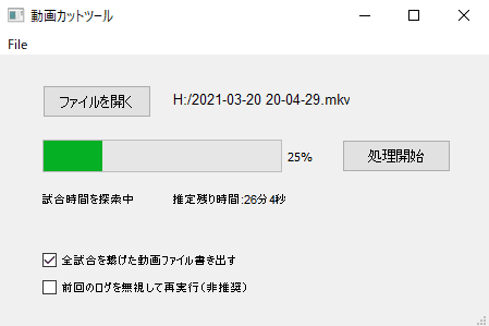 このような画面になったら,処理が完了するまでお待ちください。 緑のバーが満たされると,試合時間の検索が終了し,自動での切り抜き処理に入ります。
